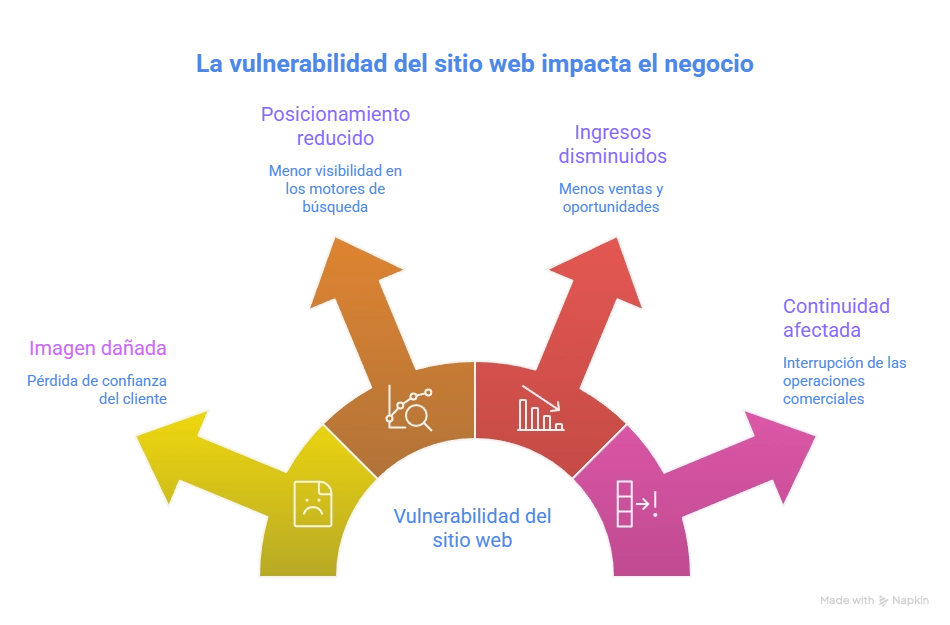 Cuando un sitio web es comprometido, los efectos no solo son técnicos. También pueden impactar directamente en tu reputación, ventas y continuidad del negocio.