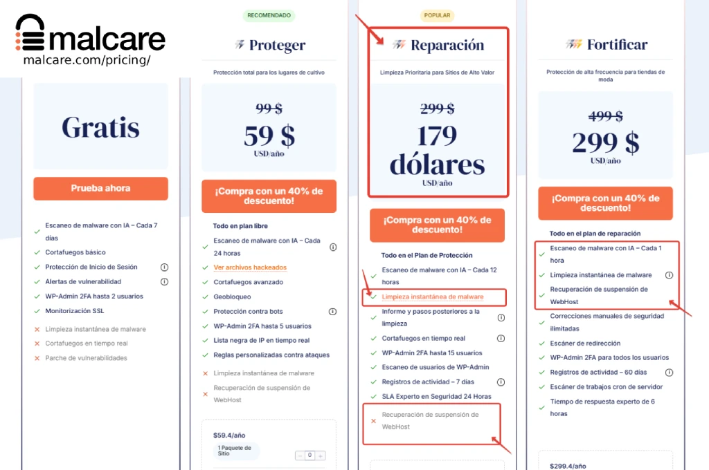 Otra opción muy conocida es Malcare. Su Plan Reparación ofrece restauración parcial en caso de incidentes. Los planes más bajos se limitan a alertar.